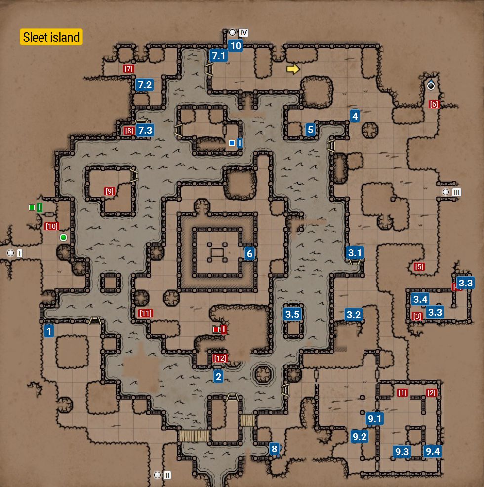 Sleet Island is located to the north of the Forgotten River. It is separated on two areas: The first one consist of the grounds surrounding an island (on which there are couple of riddles prepared) and the island itself. In order to get there, wait until night and stand in a particular spot (5). While solving a riddle with a pressure plate (3.1) you can go from a one secret to another, but it is easy to miss it. There is a Temple of Water on the island. Inside, you can exchange four power gems for an essence of water (6). On the island, you can also find a small, underwater dungeon and on the north an entrance into a big pyramid is located. In order to pass it though, you will need to have the Serpent Staff and use its ability by the doors. The Staff can be found in the Herder's Den. It is also recommended to stay under water for some time in order to catch some fish, as in the following locations you may be having some problems with the food.