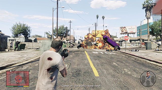 Keep pushing ahead, and keep in mind that there will be appearing new gangsters around, on a regular basis. It is best to eliminate the ones in cars by using the grenade launcher suggested above (the above screenshot) which will make it considerably easier to win fights. Just remember not to cause an explosion near Franklin or Lamar, because the death of either will mean failing the mission.