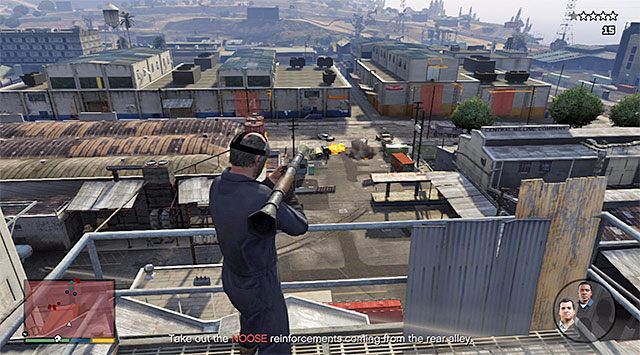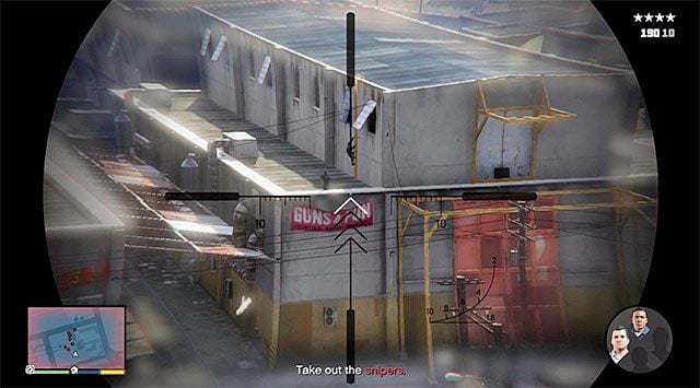 While fighting, try changing the character you are currently playing as, on a regular basis, especially that, to complete this mission in 100%, you will have to perform ten such changes. You should also take into account the fact that things will get additionally complicated. The first serious impediment is the appearance of enemy snipers on the roof of the building to the right. It would be best if Trevor took care of these characters (the sniper rifle).