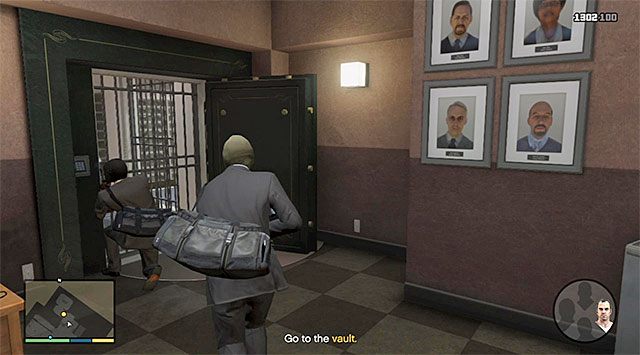 Park the van in front of the bank and come inside, at the same time target the bank's employees. Wait for the request for help at forcing the gate to the vault open, and go there. After a while, you will cut to Trevor. After you have learned the situation outside, also with this character go into the vault. Get ready, because there is the most exciting part of this mission ahead of you!