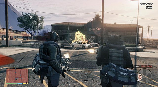 Continue playing as Trevor and start discharging your minigun in his inventory. To the extent it is possible, you should first target the police cars, because destroying them will not only allow you to deal with them quickly, but will also bring you closer to meeting one of the requirements to complete this mission in 100%, which concerns wreaking havoc. Do not worry too much about the fact that you are out in the open, because the armors of all robbers are very durable. It is also worth knowing that, as a result of enemy attacks, you will be losing small portions of the loot so, you should not ignore the enemy fire too much.