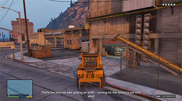 Reach the square with Michael and Trevor in it and wait for another cutscene. Drive towards the factory building that you can see in the distance. Along your way, ignore any tanks because, as long as you do not stop here, you are safe. Drive up to the factory's entrance as much as possible, which will conclude your drive on the bulldozer.