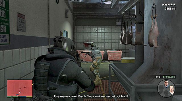 During the walk across the factory, you need to play either as Michael or as Trevor, because Franklin is not wearing the special armor and could easily die, as a result. Keep eliminating the soldiers and secure one room after another.