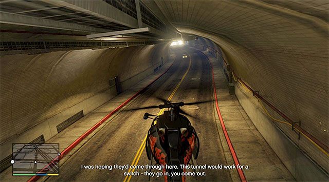 Towards the end of this phase, the vans will drive into a tunnel and, if you are planning on completing this mission in 100%, you need to fly into that tunnel also (the above screenshot). During the flight along the tunnel, perform slight movements with the analog stick in the attempt not to collide with the walls too often, which would result in the destruction of the chopper. The vans will soon enter a garage, which means an end to following them.