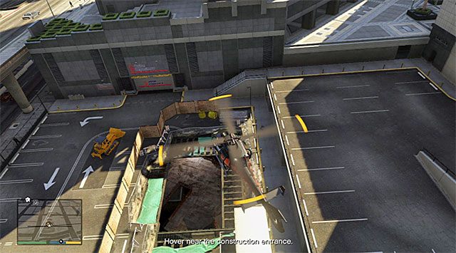 Without waiting for Lester's instructions, fly behind the bank building right after you regain control over the chopper, and hover above the construction site shown in the screenshot. Allow Lester a careful look at the area.