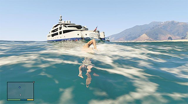 Start running towards the pier's edge and press the button that the game prompts you to, at the right moment. This way you will bounce off the ground and jump into water. Michael will dive into the ocean but, it would be good if you resurface as quickly as possible and start swimming towards the yacht that you can see in the distance (remember to keep tapping the action button rhythmically to swim faster). After you reach the yacht, climb aboard and watch another cutscene.