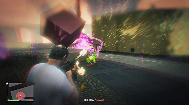 You are going to play a hilarious mission, because, due to smoking a specific variation of marihuana, Trevor will be experiencing hallucinations, whose effect is the appearance of clowns around. Use the automatic shotgun to eliminate the clowns. In the first place focus on the dancing ones.