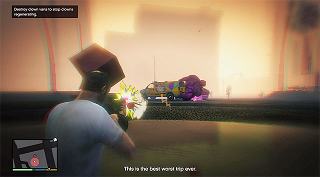 Every now and then, you should notice clown cars stopping nearby. Try destroying them as quickly as possible because this will bring you closer to completing this mission in 100%, and prevent other enemies from arriving. Continue fighting until the hallucinations wear off.