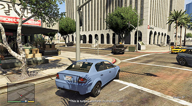 After you have listened to the conversation with Nigel, Get into his car quickly (Declasse Premier), and start a chase after the escaping Di Napoli's SUV. While playing this kind of chase, do not attempt to bump into the star's car, because you will not stop him this way. To the extent it is possible, avoid colliding with the other cars and objects in the environment.