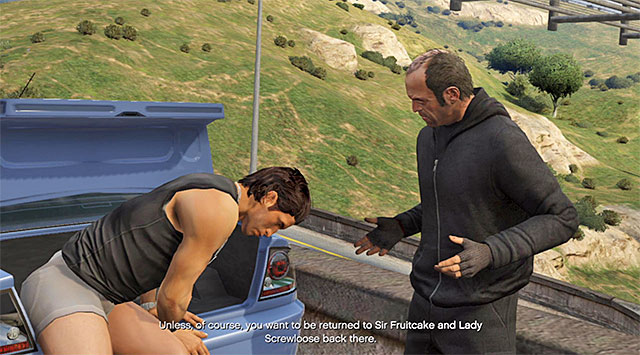 Listen to the conversation with Nigel that concerns the elimination of Al Di Napoli. Enter the old man's car (Declasse Premier) and drive towards the train station located in the eastern portion of the map. On your way, Trevor will start talking to Napoli and, if you want to make a quick buck, you can stop the car and let him out of the trunk. Know however, that this variant will make it unable for you to complete this mission in 100%.