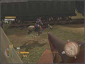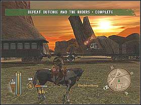When the cutscene will end, quickly hide behind the boulder on the hill and start eliminating showing up enemies [1]. Be careful and don't lean out too far, because there is an opponents' cannon, behind the bush on the left. To shoot down Dutchie, use sniper gun and fire only when the sight will change color into red. After defeating Dutchie, ride round the train and wipe out remaining riders [2].