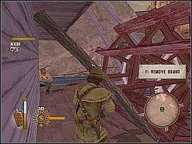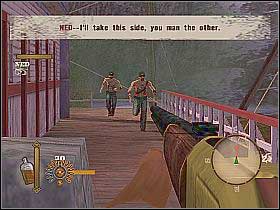 After taking over the control, shoot the enemies who attacked the ship. Cross the boat's deck and turn right, where you'll encounter several opponents hidden behind wooden chests. Eliminate them, pick up two bottles from the shelf and go east. You'll run into the bandit which is holding the hostage [1], so I recommend using slow motion and firing one, precise shot at the enemy's head. Turn left and kill some more gunmen. Now, move the wooden bar [2].