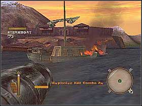 Go west and take advantage of the cannon located on the left side. Destroy all enemies' boats [1]. After the fight, move in west's direction and clear the whole lower deck from the opponents. Go up the wooden stairs, run up to Ned defending himself, and help him in fighting with some evil gunmen [2].