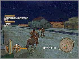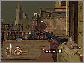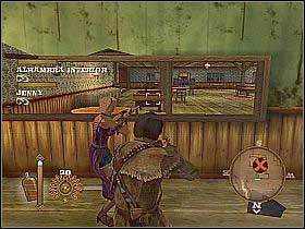 After reaching the town, visit the bar. Approach the bartender, standing behind the counter [1]. During the conversation, the big gunfight will start, so hide behind the counter and kill all showing up enemies. Take stairs on the right and go up. After another fight, exit the attic. You'll find yourself on the balcony - shoot down some more opponents [2]. Go through the wooden veranda and enter the building back by taking the passage located on the right.