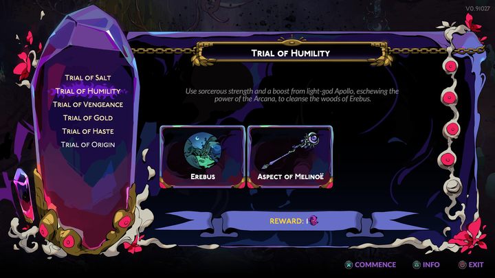 The Chaos Trials are short challenges that you can start at the Pitch-Black Stone. These are shorter expeditions that require you to complete one specific region with the rules imposed by the game. You will receive a specific weapon, sometimes a specific keepsake, and often several boons from one specific god. Occasionally, you will also have to deal with a time limit. Each attempt consists of only one region, and after defeating the boss of a given region, you will return to the Crossroads. The reward for each completed trial is one unit of Star Dust.