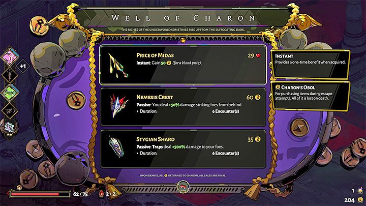 Here's an interesting fact - one of the purchasable items in Charon's Well can be obtaining money in return for some HP. We advise you to only use this option if the well contains a very useful item you can't afford, or if your maximum health is very high and the loss of health wouldn't be too big of a deal.