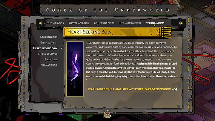 This page of the guide to Hades contains a detailed description of the Heart-Seeking Bow. We explain what are the requirements for unlocking the bow, what types of attacks the Heart-Seeking Bow has, and what are the recommended fighting tactics when using the bow.