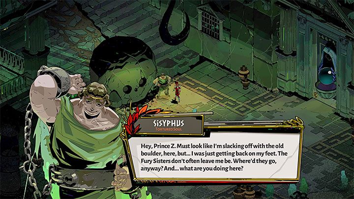 In Tartarus, you can also meet Sisyphus, who is a unique NPC of this biome. From Sisyphus, you can always take one of three valuable items - gold, Darkness, or Charon's Obole.