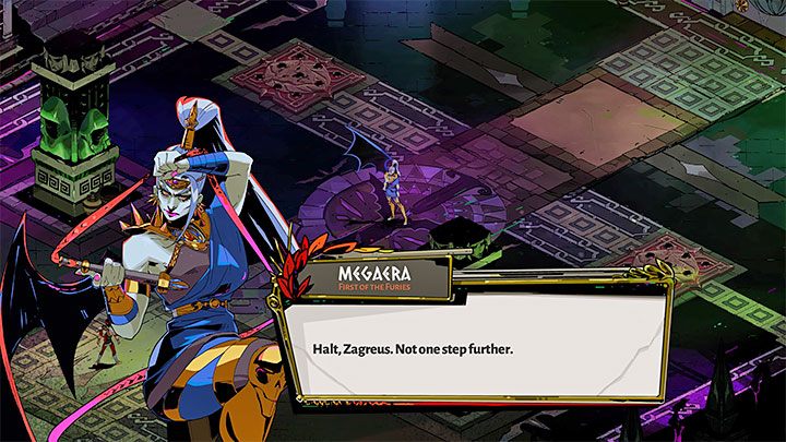 The default final boss of Tartarus is Megaera. In the later phase of the campaign, her sisters may appear instead. The general course of the fight is similar for all sisters, with each having some of theirs attacks. The shape of the battle arena and the types of minor opponents that appear in the arena can change to some extend. A description of the boss battles of Tartarus, you will find in a separate chapter, Bosses, of our guide.