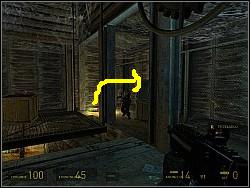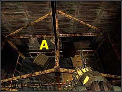 After killing it, go straight. Take the goods from the crates which you can see on the upper screenshot. You will get to some kind of a lift. To go down you will have to put something heavy on it. Use the gravity gun to do so. Then the lift will move down. Remember to jump on it before it's too low. Mind the crates with goods (A) when going down. | ![]() |