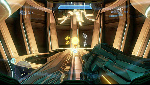 When Cortana disappears, turn around and head to door you entered here. In half of your way, a passage will be open on right. Then you get to the big door with five guards. When they're open, walk into a blue beam of light.