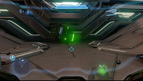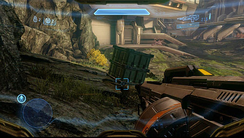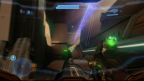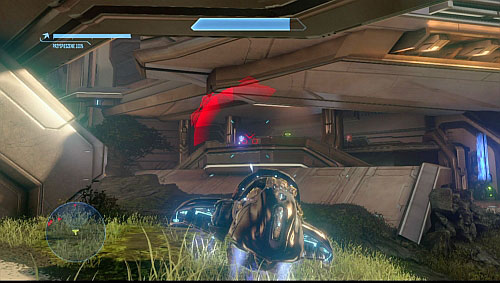 After a cut-scene you find a Hardlight Shield on a table. After crossing another door, you get to an open space. Ride lower with elevator and go up to the passage. You get to the ship from which someone will be firing at you. Kill the shooter and the ship will flee. Go through next groups of enemies until you see Banshee. Kill a sniper nearby it (screen). Kill enemies standing under the platform.