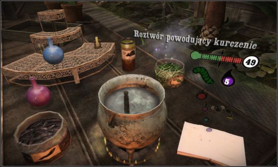 Making potions is the last minigame available. The rules are simple - you have to mix, warm up and pour and throw in ingredients on the right in the right amounts, so that the potion changes colour. If you overdo, smoke will begin to come out of the pot - move the mouse to the sides to get rid of it. Also keep an eye on the time limit, displayed in the upper right corner. A good ingredient adds a few second to the timer, but you can forget about any additional time if you make something wrong. Basically, that's all there is to know about making potions. It can be quite tricky in the beginning, but you'll get a hang of it after a while.