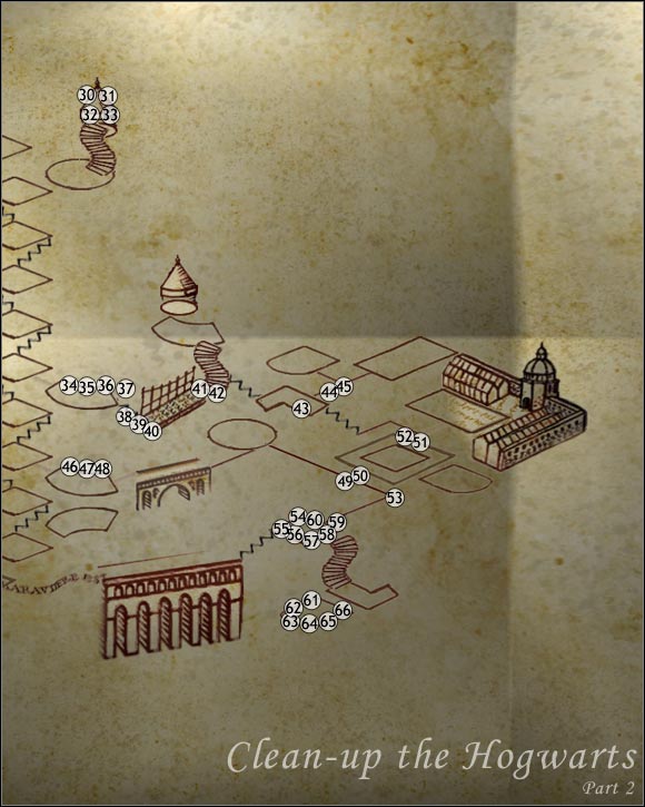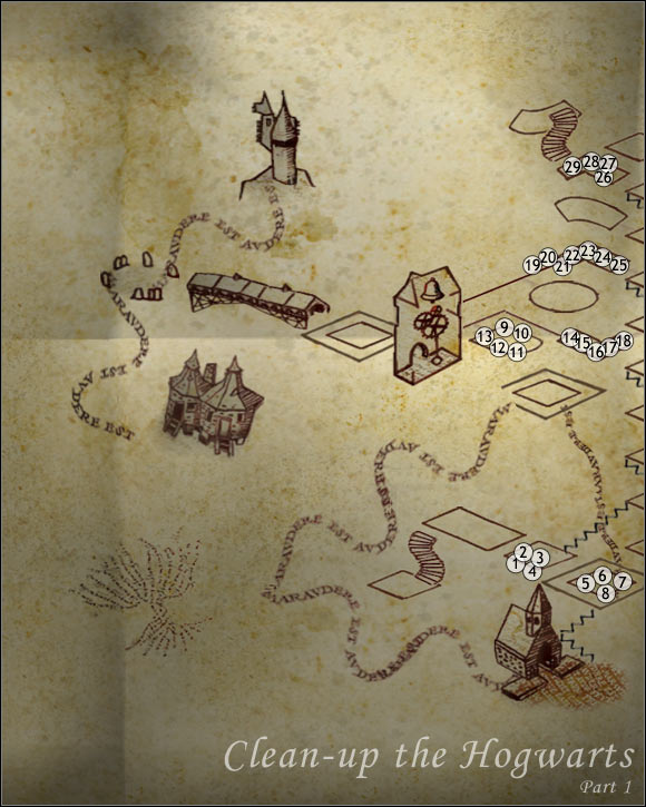 Hogwarts is a bit devastated. You can get additional Discovery Points for cleaning up the mess in 66 places. This is quite a number, but these places can be easily recognized. Here are tips about cleaning and two maps with marked places to clean.