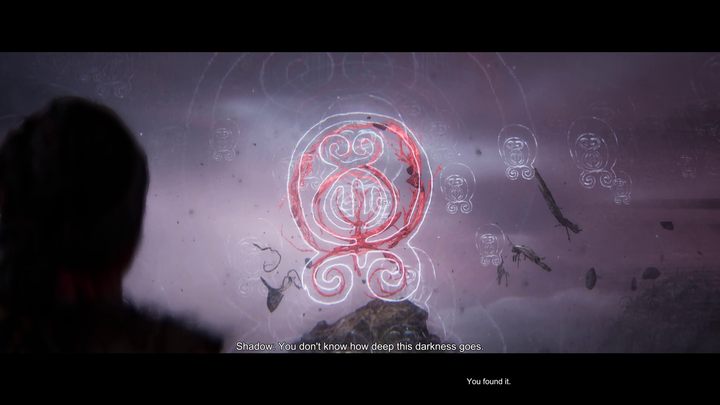 - After climbing to the top of the cliff, follow the designated path. After reaching a narrow pathway above the chasm, press the Interaction button. Senua will stick to the wall. Slowly move to the other side.