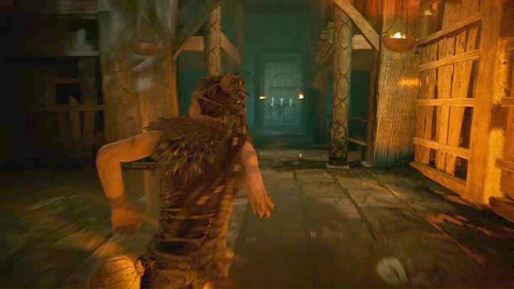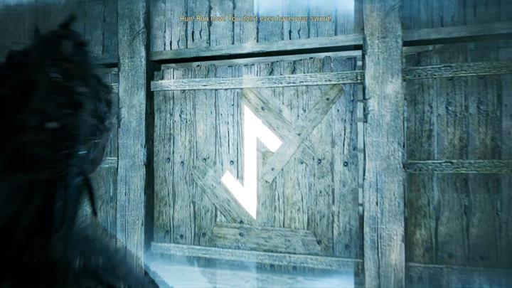 Turn around and go right. Turn left at the crossroads, then go right, right, and forward beneath the planks. You'll encounter the third rune. Pick it up while running, turn around and go right, right, left through the door and right at the junction. You'll finally reach the runed door. The sequence will end, leaving you with a new fragment of the sword.