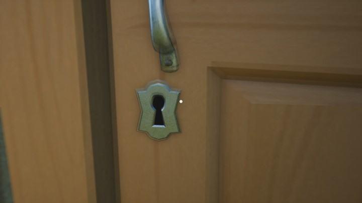 - After regaining control over your character, approach the door and peek through the keyhole. Keep doing it until you see a drawn character and the door opens.