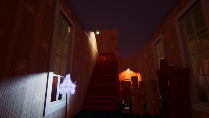 - Firstly, enter the neighbor's house through the front door and go to the right along the corridor until you reach the stairs visible above. Go upstairs.