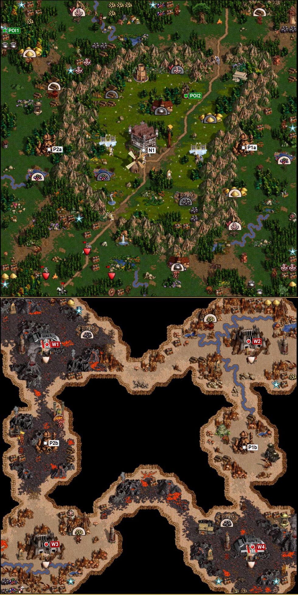There's only one thing to do - send Christian to the underground entrance located to the East of your Castle (point P1a on the map), and order the second hero, with the freshly acquired Angels, to go to the second entrance (point P2a on the map). Their goal are four enemy cities (points W1, W2, W3 and W4 on the map). Seize control over three of them, and as soon as you arrive at the last one, you can use the same tactic like during the ending of the previous mission - you can block the exit from the enemy city by placing a hero with a powerful army there. In the meantime, send all your heroes in places where they can earn experience points, as well as learn spells (you should build Mage Guilds in every seized city and send your heroes there) - this will come in handy in the last mission of this campaign, as your 8 most powerful heroes will be transferred there. After you've finished leveling them up, capture the last city and end this mission.