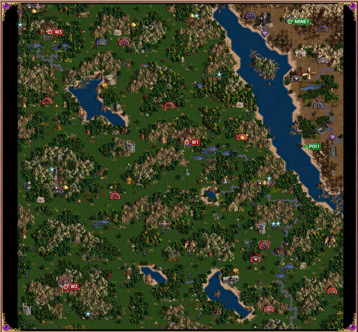 By going West you will get to the blue enemy city - Rampart (point W1 on the map). To get there, you must circle around it from the left side. Conquer it as fast as possible and start turning the creatures found there into Skeletons. After capturing it, head South-West - there you will find another enemy city, this time of Castle type (W2). Along the way you will stumble upon masses of Pikemen, which can be turned into Skeletons. There's only one enemy city left to capture - it's located in the upper left corner of the map (point W3 on the map).