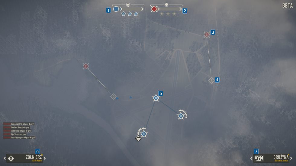 The interface just before you enter the combat, just like the previously described one, takes almost the whole surface of your screen, but at the same time contains very important information. In the middle of the upper edge of the screen you will find the information about both teams' task completion progress - the blue one [1] represents your team, while the red one [2] the enemy team. Stars shown below the bars represents the objective points the team managed to capture. Points with the number 1 [3] represent access points, which, after the defending team captures them, prevent the attacking side from using the whole line. Points with numbers other than 1 [4] are called control points, which are just fillers. Those with the Ox mark [5] are called objective points and are the most important points on the map.