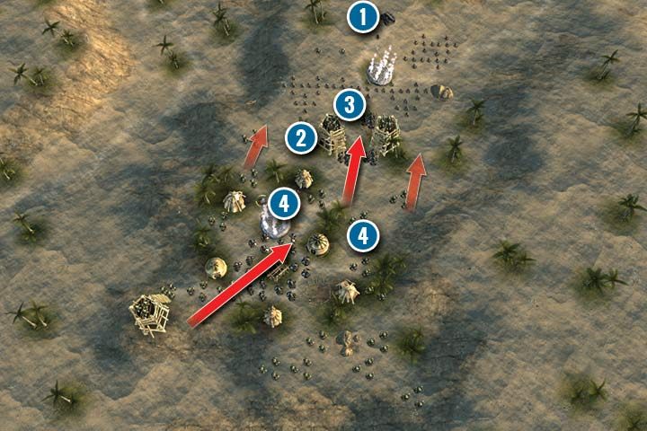 Approach the enemies in the fortifications (3) to lure them out. After that, place your units in these fortifications and start fighting the enemies. Use your heroes to block narrow passages in the village (4) and to slow the enemies down. Sometimes, it is better to keep fighting with a unit consisting of a single soldier rather than eliminating it, giving space for a new unit with a full lineup. Eliminate Warlords first. Thanks to that, your infantry will have no problems with dealing with the rest of the Orcs.