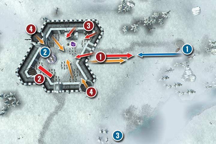 Skeletons are a challenging enemy. They don't have any special abilities but they are their units are very resistant. Inside the fort, you can find 3 squads of Skeleton Infantry located near the teleport (2). The first thing that you should do is to send your hero there and see how things will play out. Try to lure them away from the teleport so you will be able to summon more units. There are 3 Skeleton Archers squads located on the eastern walls (3, the arrows). Defeating them has the same priority as defeating the units on the ground. Your hero can't use a ladder nor an elevator which means that you have to summon someone to kill them. Defeat the Skeletons near the teleport and summon, e.g. a Catapult and place it on the walls. You can do that by using the elevator in the south and then place the Siege Equipment on a tall tower.