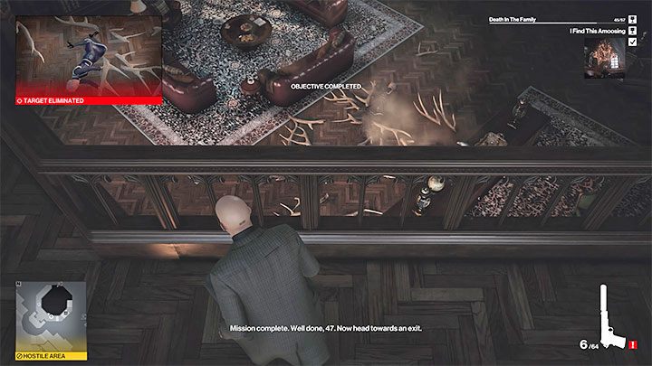 The chandelier associated with this challenge is located in Alexa's office on level 2(point 37 on the map), and you will recognize it by its unusual appearance resembling hunting trophies. When you reach the office, hide on level 3 - on the balcony or the roof. Alexa returns to the office several times during the initial phase of the mission (before the family reunion). Wait for her to pass under the chandelier and use the silencer gun to make it fall.