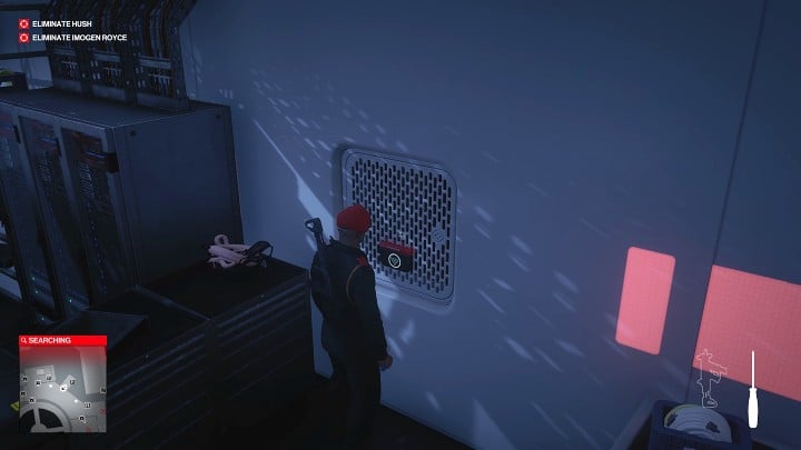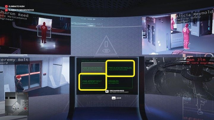 Once inside Royce's office, approach the computer and fire two employees - Jeremy Bolt and Alicia Reynold. Jeremy Bolt stands at the main door leading to the Data Core room. After he's fired, he will start a contention with Imogen Royce's private bodyguard, so he will not accompany her to the location where you will eliminate her. Alicia Reynold can also thwart your plans so it's worth getting her out of the way. After doing so, immediately hide in the shaft.