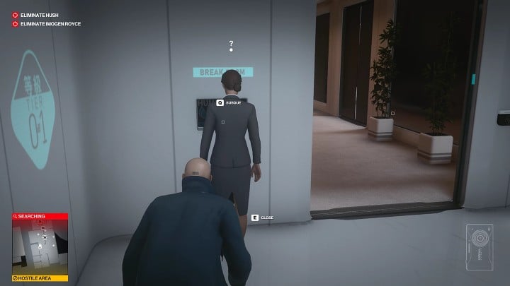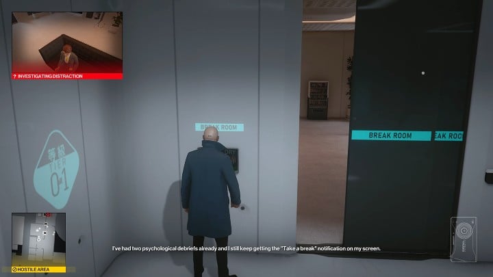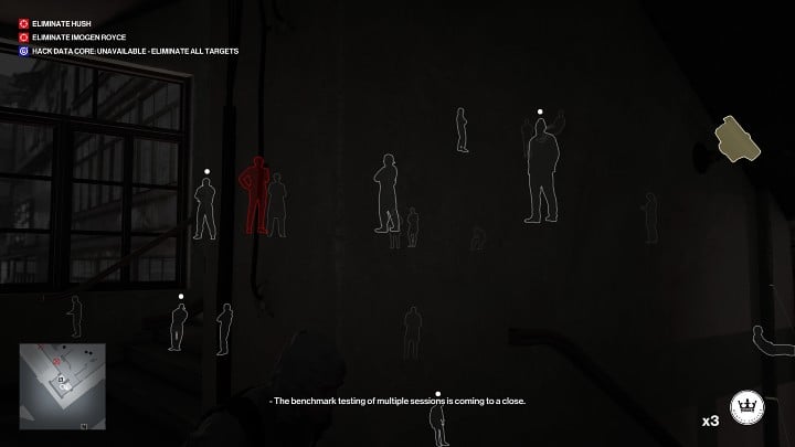 Enable Instinct to see if the road is clear. If you end up in Hush's cycle where he goes down a floor below to talk to his co-worker, you'll have to wait in the stairwell a little longer. There is one guard stationed on the left, walk over to the lab area the moment he is not looking in your direction.