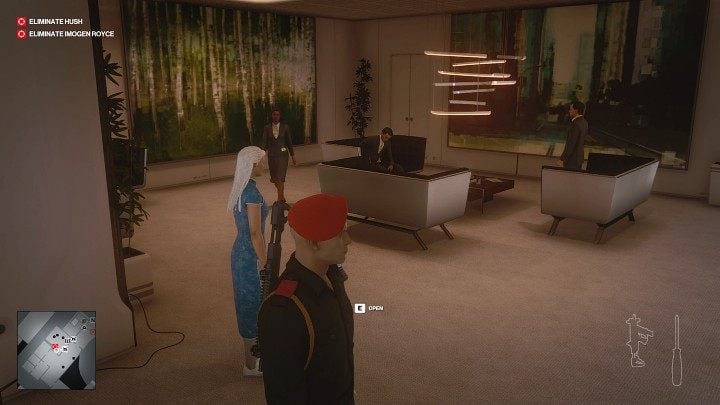 Crouch in the spot shown in the image above and wait for Imogen Royce. Remember, there is still one employee - Alicia Reynolds - in the room to the left, by the computer.