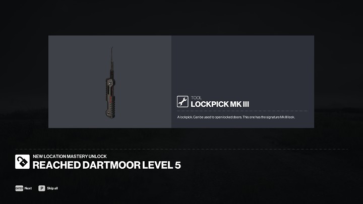 After completing the mission and tallying up the point score, notifications will appear on the screen with information regarding the championship level earned and new items unlocked. The image above shows an extremely useful item (lock pick) that can be unlocked as early as at Mastery Level 2 in Dartmoor. Most of the maps available in Hitman 3 allow Players to gain up to 20 Mastery Levels.