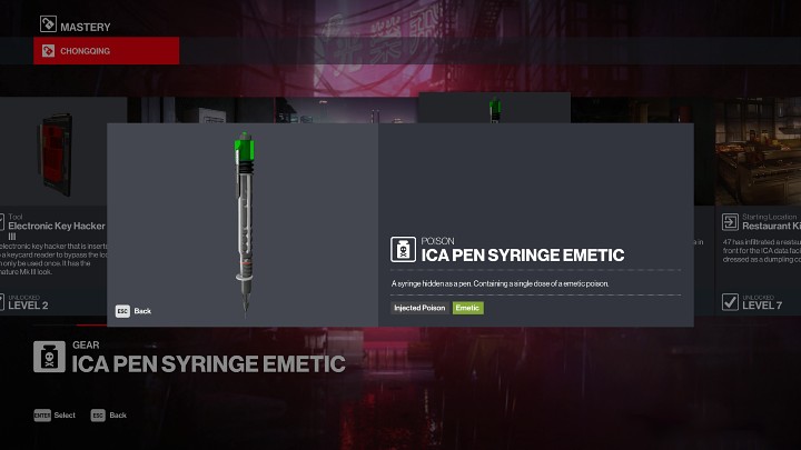Emetic Poison Vial is a poison that induces vomiting in the target and forces them to go to the nearest toilet. This gives Agent 47 a chance to obtain the disguise and even eliminate the mission target by drowning him in a toilet.