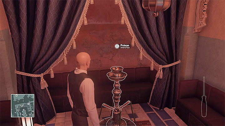 In this variant, you are to poison Kwang. The shisha pipe is in one of the rooms of the VIP area (M10,7). You can enter there, after Kong Tuo-Kwang leaves, even if you are not wearing any disguise. It is best to poison Kwang using lethal poison. Since it is impossible to find it on the map, you would have to take it with you on the mission.