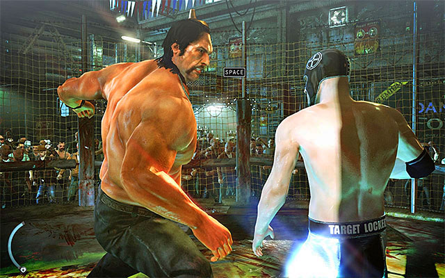 Once you get explosives, go to metal balconies on the first floor of the arena. Place yourself at the railing, near the entrance to the VIP box (screen above). Now throw the explosives over the cage and wait for the explosion or use the detonator.