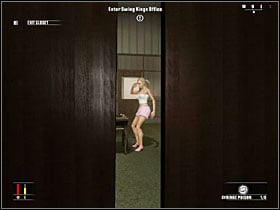 Go to the office through the door on the left. Take the syringe and go up the stairs. When the guard is done walking, push him out of the window. Enter the office and use the syringe on her drink. Enter the closet and wait until she's off.