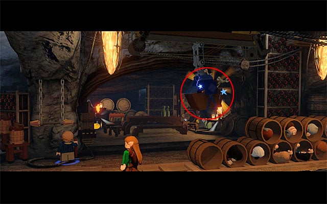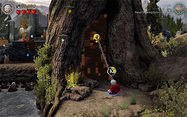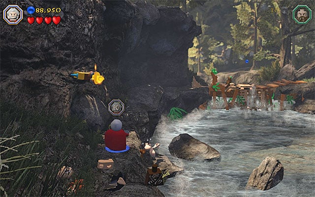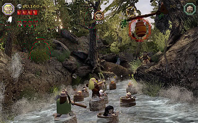 While completing the last, eleventh chapter of the game in the story mode, you have been unable to explore the stone ledge neighboring the first dam. While replaying the ninth mission in the Free Play mode, this is available and even required, because there are several collectibles around. Right after you complete the scene with the cellar and reach the dam, remain on the pier, where you get after you jump out of the barrel. Switch to Saruman here and use his staff to destroy the mithril objects shown in the above screenshot. Carefully, jump over to the rock (it is easy to fall into water here!) and over to the bigger ledge that you have just unlocked, on the right.