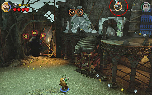 While completing the fourteenth chapter of the game in the story mode, you have been unable to explore the tomb neighboring the external yard. While replaying the fourteenth mission in the Free Play mode, this is available and even required, because there are several collectibles in the tomb. After you make it into the inside of the keep, take all of the steps necessary to get to the upper-right balcony. Switch to Saruman here and prepare the Saruman's Staff. Enter the aiming mode (hold down the action key/button) and aim at the mithril gate shown in the above screenshot. You can now enter the tomb.