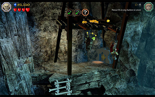 Explore the area around the fan that you have just built and find the interactive item, which you can pick up. Go left and throw the object at the crate suspended from above. wait for the crate to fall down and smash. Hold the building key/button here, thanks to which you will unblock the manhole. Switch to Bilbo and walk through the manhole. After you get to the higher level, smash the elements in that area and build a ladder. Thanks to this, the confused goblin will be able to reach the ledge above.