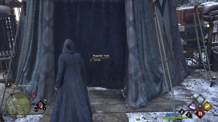 Walk over the bridge to the second part of the camp. There is a Poacher Tent inside. It will turn out to be magical, because you will find yourself in a huge new location where illegal dragon fights are organized.
